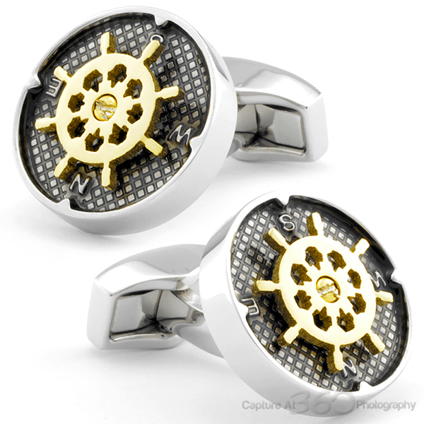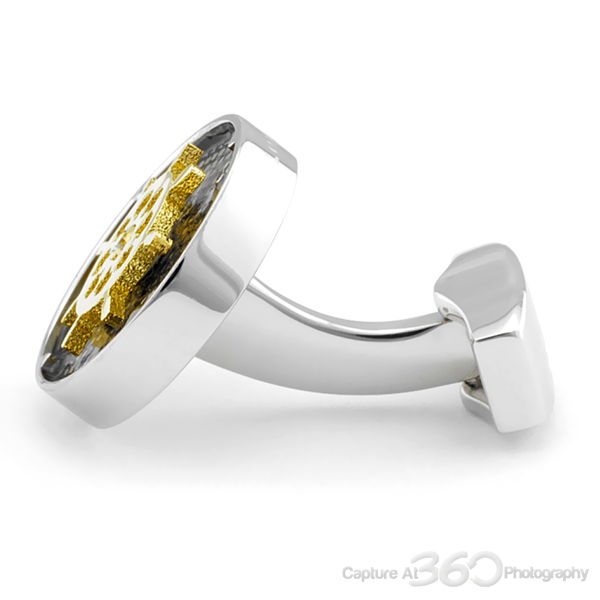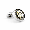 This collection is made up of twelve different sporting activities. Each design consists of the Tateossian signature diamond pattern covered with charcoal enamel and a raised yellow gold colour plated rotating element. All the designs are interactively moveable and symbolise a famous sporting activity. Rhodium plated case with spinning element plated in yellow gold colour.