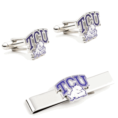 TCU Horned Frog Cufflinks and Tie Bar Gift Set.The official logo of the Texas Christian University Horned Frog. Enamel finish cufflinks on a nickel plated backing. John Davis, the billionaire founder of 1-800-Flowers, author Sandra Brown and actor Chris Klein all attended Texas Christian University in Fort Worth, Texas. If you are an alumni who has chanted the fight song words, "For TCU, so tried and true, we pledge eternal loyalty," then these officially licensed Texas Christian University Horned Frog Cufflinks and matching tie bar would make the perfect addition to your accessories repertoire.