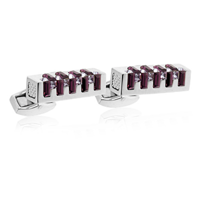 These Purple Interlock Rectangular Cufflinks, designed by the famed London based company, Tateossian, feature a horizontal rectangular column set intermittently with baguette and square cut Swarovski ELEMENTS crystals. The crystals appear beautifully at regular intervals along the two faces, forming an enchanting interlocking pattern. As with most all Tateossian designs, these cufflinks feature their signature diamond hatch texturing on the outer ends of the cufflink. Tateossian products have been featured in Esquire Magazine, GQ, and Vogue, making them ultra-hot items this year. And remember, all Tateossian Cufflinks arrive in a sleek gift box, making them great gifts. The charming hue of these Purple Interlock Rectangular Cufflinks is just enough to add that extra touch of color and class to your ensemble, without being too flashy. Bold, trendy, and stylish these intricate gems will compliment any suit jacket color, in virtually every season.