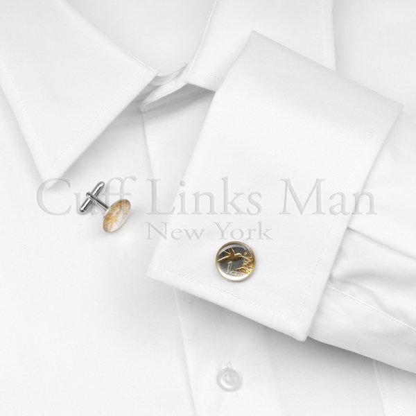 This coin is a dime size. Each one of these real coins from around the world is first layered in pure bright silver. Then, by hand, the figures of each are highlighted and brought to life with rich, pure 24KT gold. This breathtaking work, done exclusively by J & J Jewelers, turns these coins into stunning and true works of art. This coin is a dime size. Each one of these real coins from around the world is first layered in pure bright silver. This breathtaking and exclusive work turns these coin into stunning and true works of art. Each coin is hermetically sealed against wear in clear, hard acrylic coating. The coin is the size of a U.S. dime.