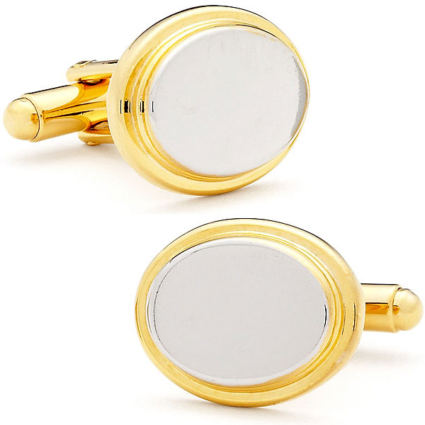Silver and gold tone come together to create the ultimate classic design. Personalize the Two Tone Oval Cufflinks with initials, names or dates to construct the perfect gift for any man. Cufflinks by Ox and Bull Trading Co. Approximately 3/4"W x 5/8"H, Stainless Steel, Bullet Backing.