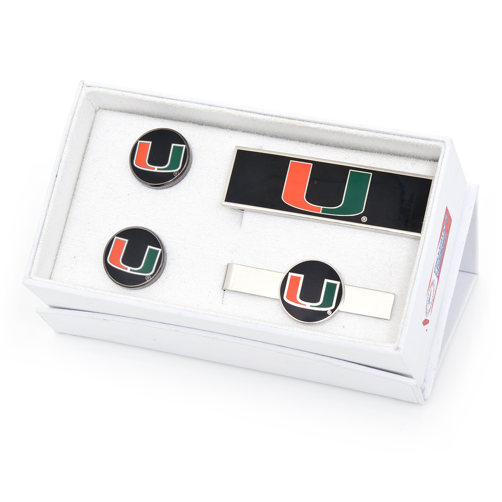 The perfect gift for the sports lover in your life, the University of Miami Hurricanes Gift Set features a pair of Officially Licensed Cufflinks, A Team Tie Bar And Moneyclip. Ideal for the fashionable fan, support your team in the most sophisticated of ways. Officially Licensed By NCAA.