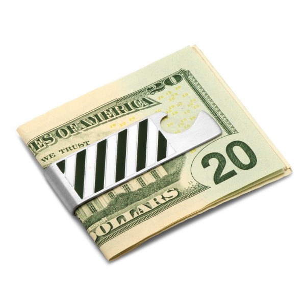 The Varsity Stripe money clip is approximately 2 3/8" x 3/4" and constructed of Stainless steel with Enamel. Functional Bottle Opener.