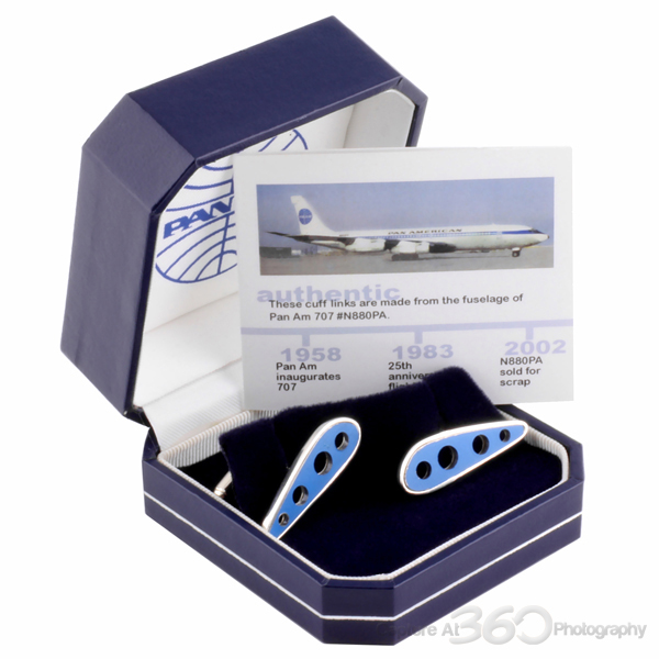 One of the first 707 planes in the air can now fit on the sleeve of your shirt! This beautiful blue set of cufflinks is made from the fuselage of Pan Am, 707 #N880PA. The first Pan Am 707 was inaugurated in the prolific year of 1958 and was sold for scrap parts in 2002. It’s like owning a piece of history, one that you can take everywhere you go. With all products from Tokens & Icons, you receive a certificate of genuine authenticity. This Vintage Pan Am 707 Fuselage Cufflink Set is perfect for pilots, history buffs, plane enthusiasts, and antique collectors everywhere.