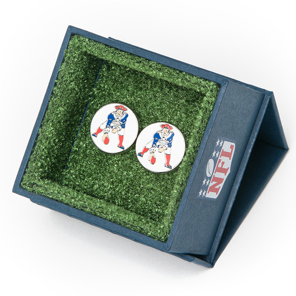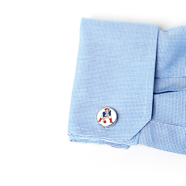Vintage Patriots Cufflinks. The retro logo of the National Football League’s New England Patriots. Enamel finish cufflinks on a nickel plated setting. A great gift idea for the ultimate Pats fan. Comes in the dazzling turf NFL gift box, perfect for presentation. The old "Pat Patriot" logo of the New England Patriots used through 1992. It's still used every once and a while during the NFL's "retro" weekends. Enamel finish cufflinks on a nickel plated backing.- Approximately 3/4" x 3/4" - Enamel and silver plated - Bullet back closure.