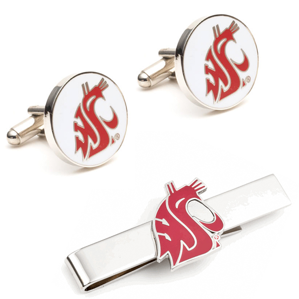 Sport your ties in style by adding the Washington State Cougars cufflink & tie bar. The ultimate gift combination for the executive sports fan. Co-founder of Microsoft, Paul Allen, the creator of the "Far Side" cartoon, Gary Larson and the "Science Guy" Bill Nye all hailed from the distinguished halls of Washington State University. If you are an alumni and chanted the fight song, "Fight, fight, fight for Washington State, win the victory! Win the day for crimson and gray!" then you owe it to yourself to get this officially licensed Washington State Cougars Cufflinks with matching tie bar gift set.