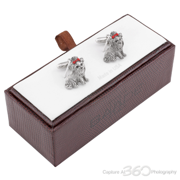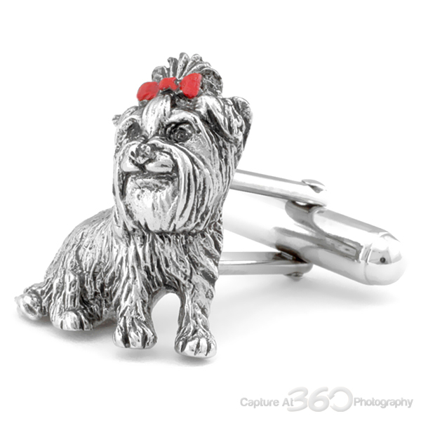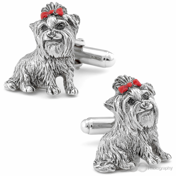 Our Yorkshire Terrier Cufflinks feature an adorable little yorkie pup, hand crafted by american jewelry designers from Baade. The shaggy haired, smiling yorkshire dog is made from highly polished rhodium metal, which is tarnish resistant, and subtly antiqued for a vintage look. These cufflinks make a perfect gift for Yorkshire owners, dog breeders, and dog lovers everywhere! Wear them to the "Best in Show" Dog shows and any time you can't take your precious pup with you.